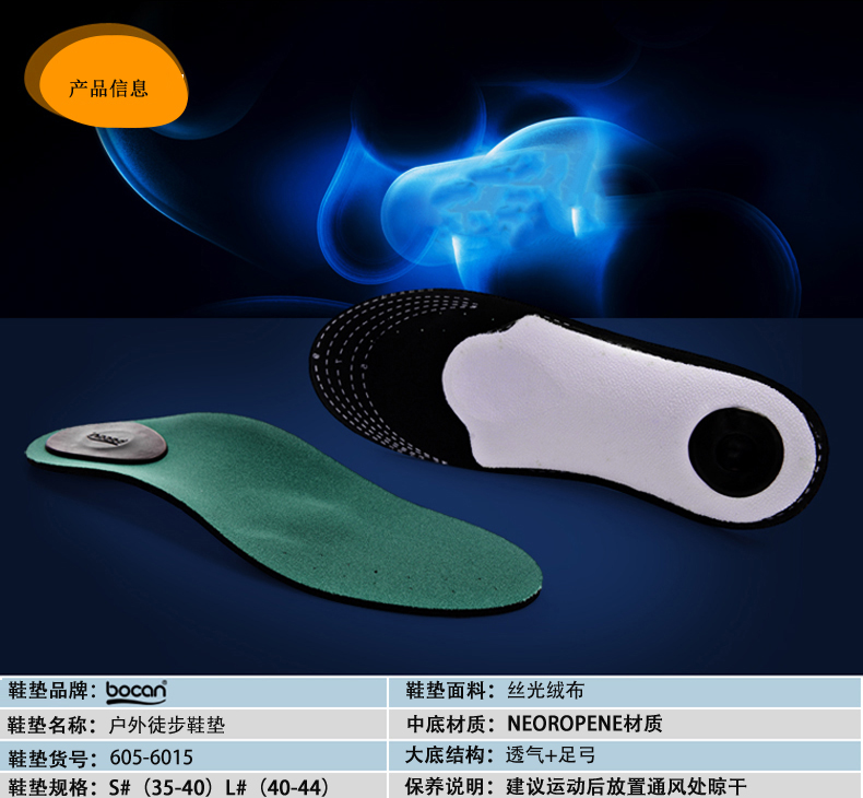 bocan旅游鞋垫男女 防护 透气 吸汗 内增高 休闲足弓垫 军训鞋垫 可自由裁剪