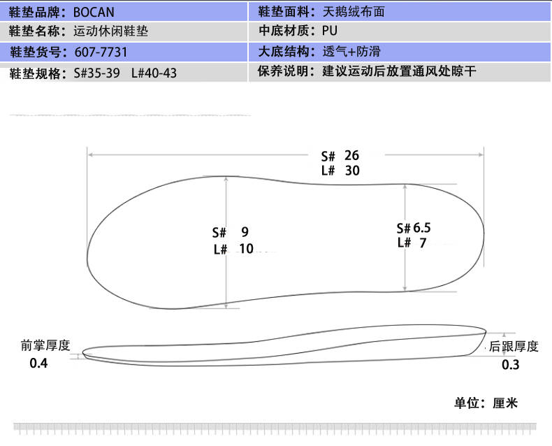 bocan通用款系列鞋垫 增强摩擦适合羽毛球 乒乓球等运动 军训鞋垫可自由裁